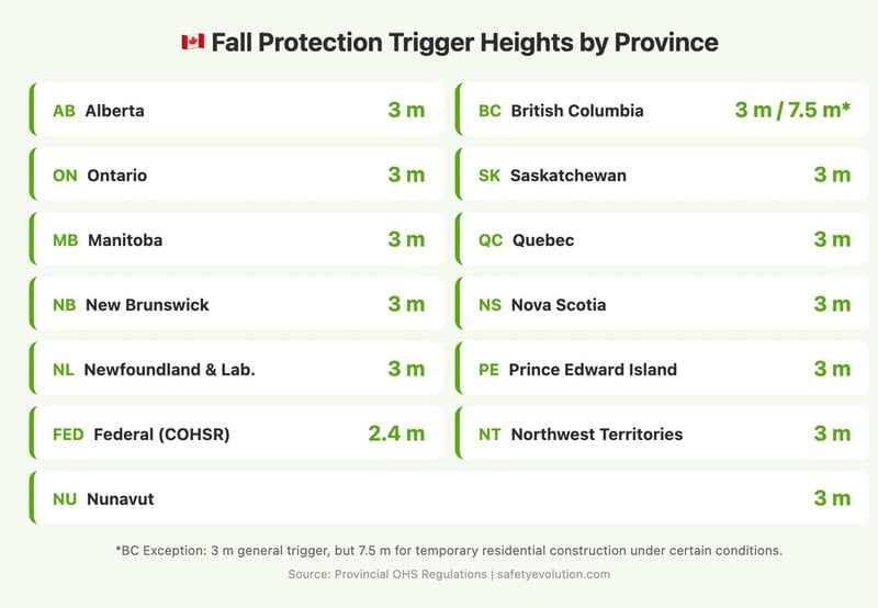 Every Canadian province and territory sets 3 metres as the general trigger height for fall protection. The federal Canada Occupational Health and Safety Regulations (SOR/86-304, Section 12.07) establish this baseline, and every province follows it.