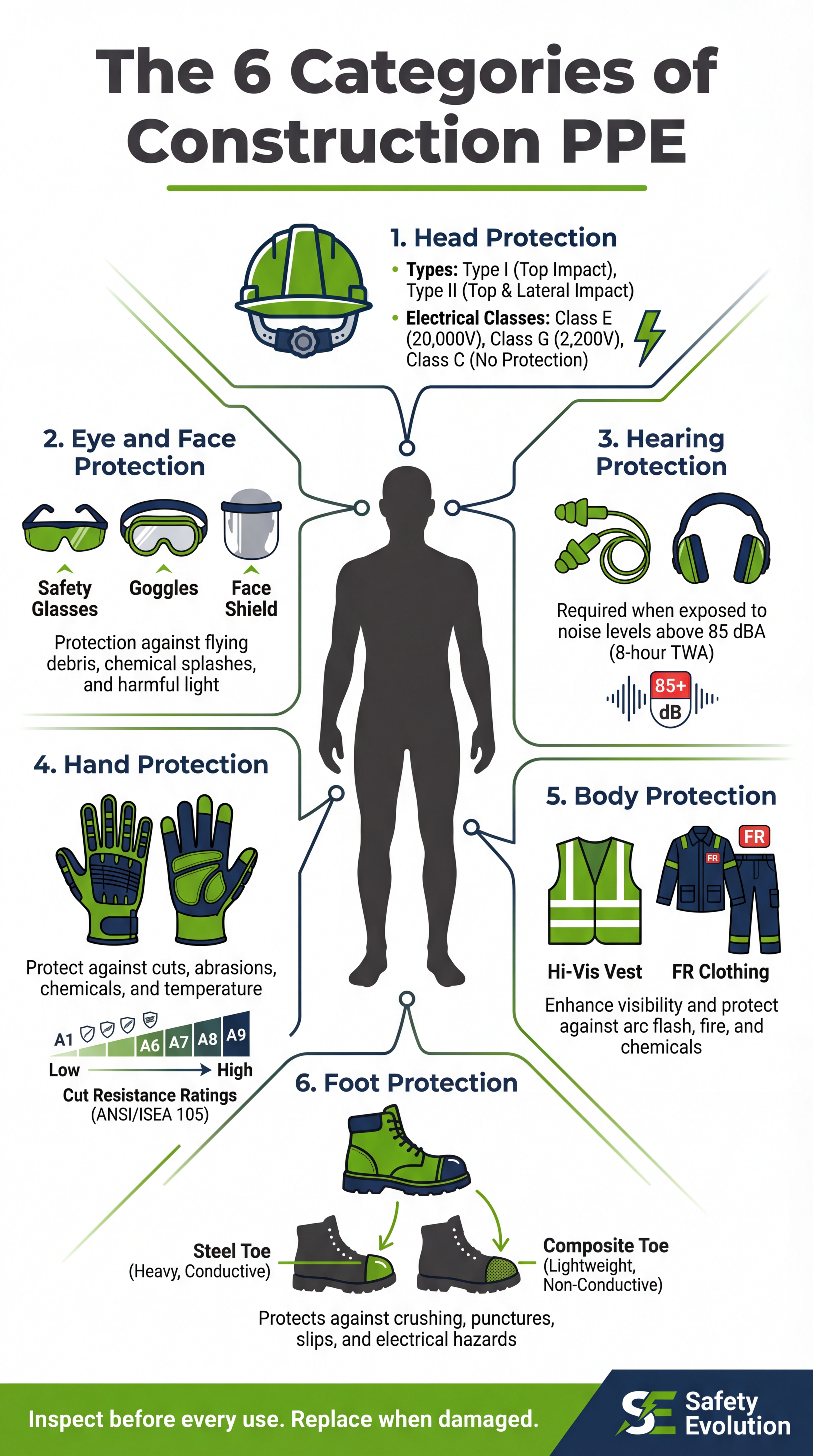 Quick Answer: A PPE toolbox talk should cover the six main categories of personal protective equipment used in construction: foot protection, hand protection, head protection, eye and face protection, hearing protection, and body/clothing protection. Start with a hazard assessment to determine what PPE is required for each task, then train workers on proper selection, fit, use, inspection, and storage. PPE is the last line of defense after engineering and administrative controls, but it is often the one thing standing between a worker and a serious injury.