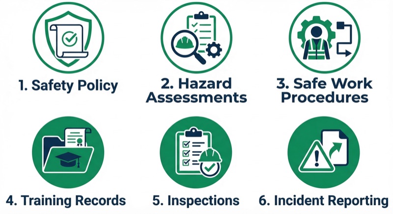 3. Safe Work Procedures. Written procedures for your high-risk tasks. If your crew works at heights, operates heavy equipment, or handles hazardous materials, you need documented procedures that describe how to do the work safely. Not a generic binder from the internet. Procedures specific to your work, written in language your crew understands.