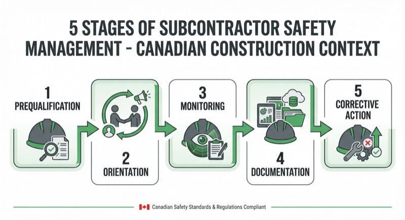 A subcontractor safety management system has five stages. Each one sounds straightforward, but the friction is in the details. Let's walk through what actually happens at each stage and where most contractors get tripped up.