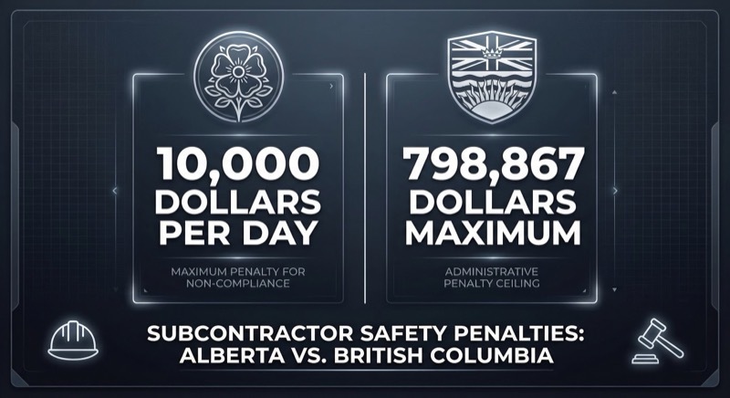 In BC, WorkSafeBC holds the prime contractor responsible for coordinating the health and safety activities of all employers at a multiple-employer workplace. The statutory maximum penalty in 2025 is $798,867.87. That number isn't theoretical: WorkSafeBC regularly issues six-figure penalties to prime contractors for failing to manage subcontractor safety.