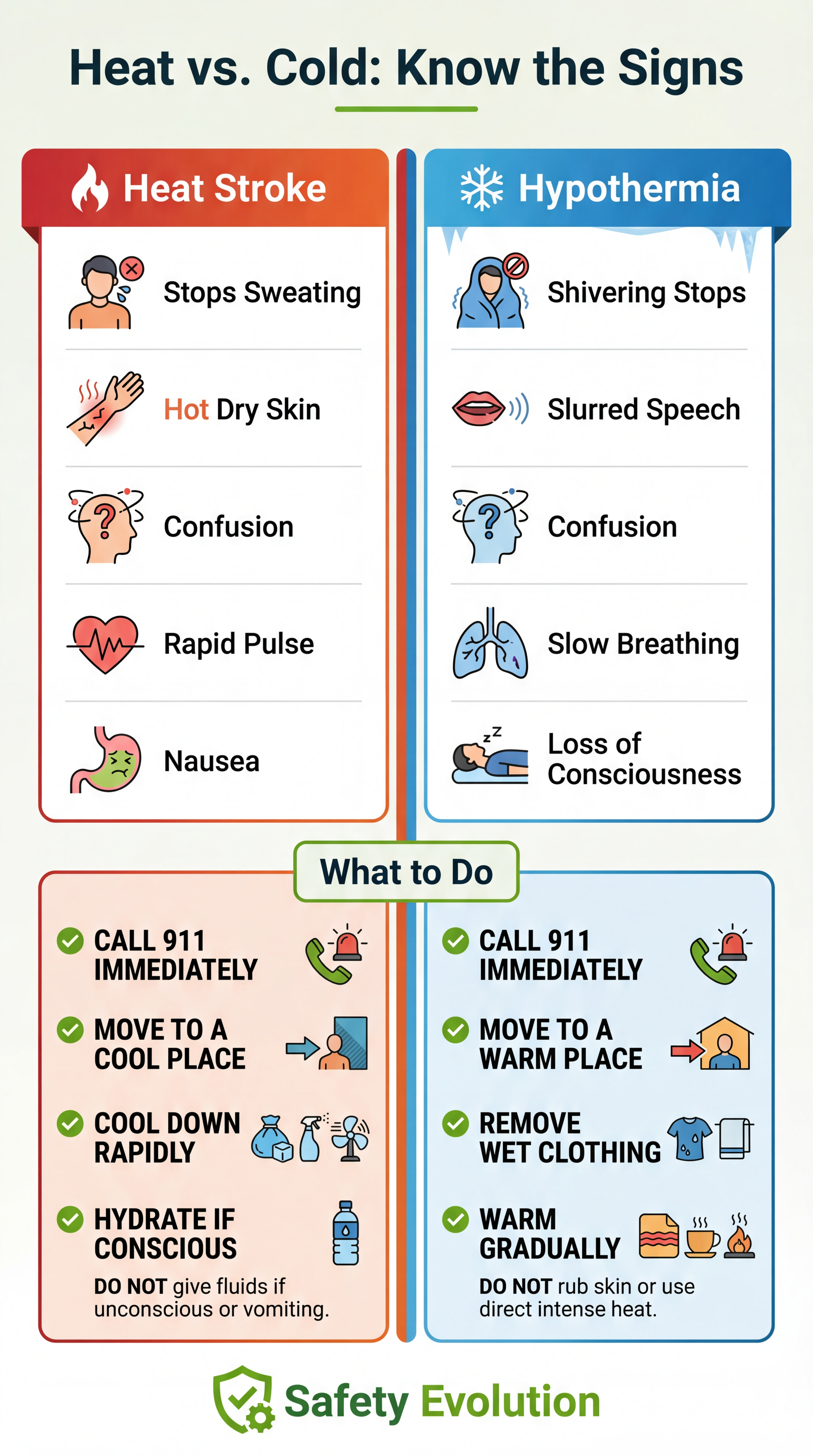 What to do: Call emergency services immediately. While waiting, move the person to shade or an air-conditioned area. Remove excess clothing. Apply cold water, ice packs, or wet towels to the neck, armpits, and groin. Do not give fluids if the person is unconscious or vomiting.